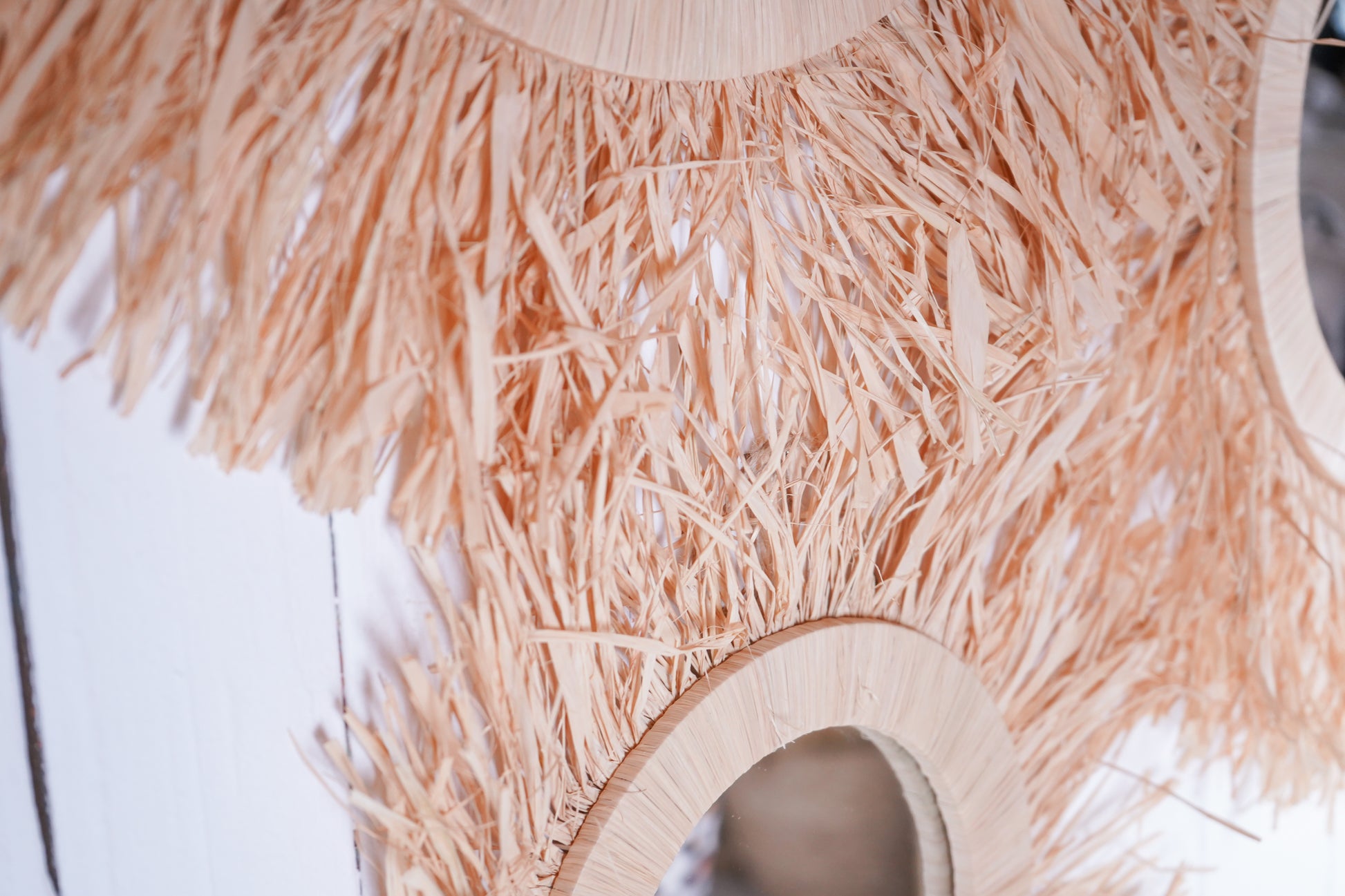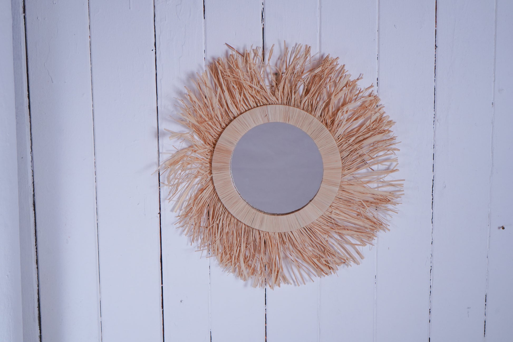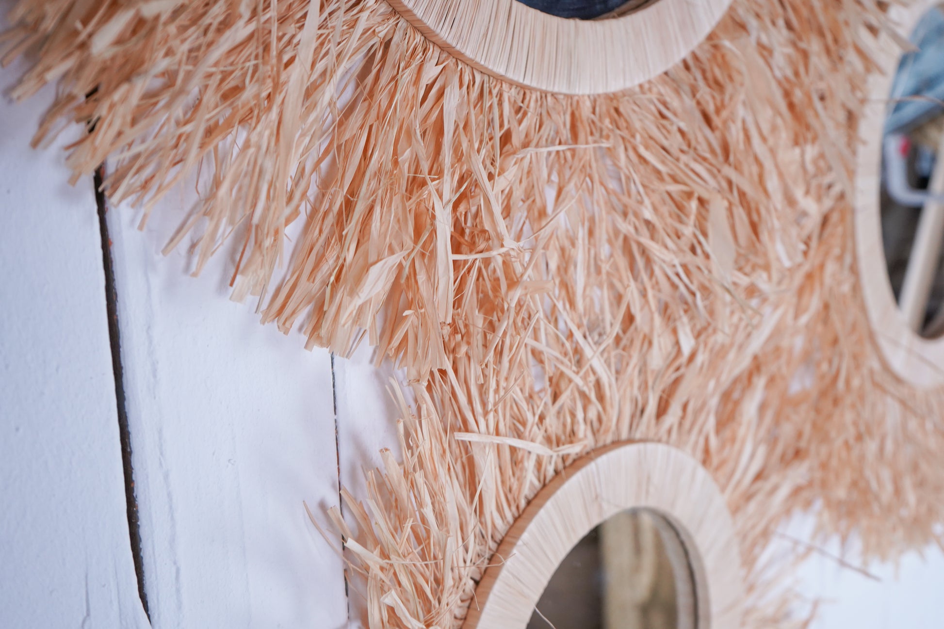 - Natürliche Raffia: Der Rahmen besteht aus Raffia, einer robusten, nachhaltigen Faser, die sowohl langlebig als auch umweltfreundlich ist. Die feine Handarbeit und die natürlichen Materialien machen jeden Spiegel zu einem Unikat.